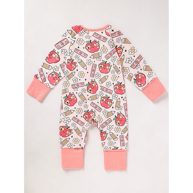 Celebrate your little baby girl with this adorable school-themed romper , featuring playful apple and pencil prints perfect for back-to-school photos and daycare adventures . The soft fabric and zipper closures ensure all-day comfort for busy little learners.