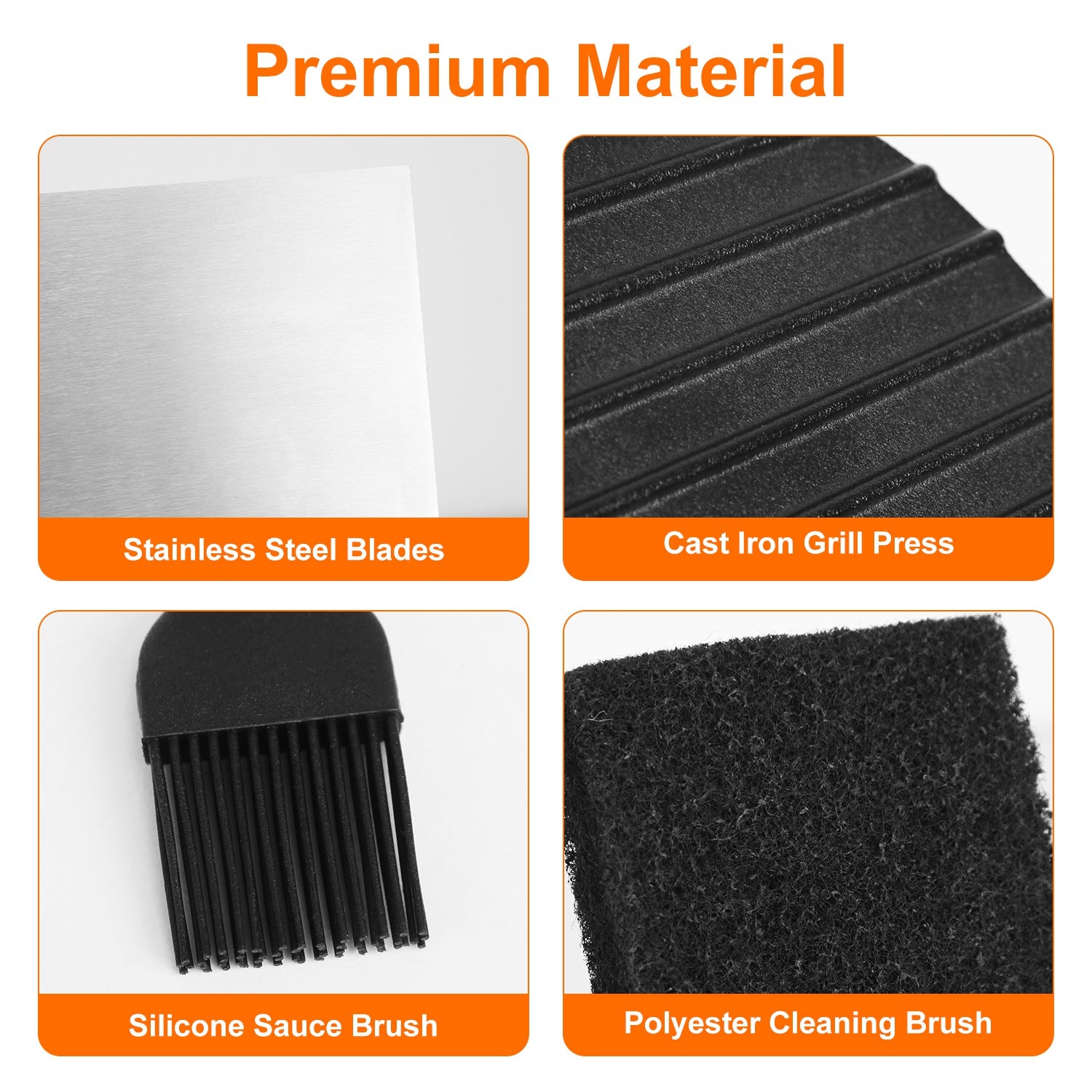 - *Premium Top Grill*: Premium materials(Stainless Steel,Cast Iron,Anti-scalding Plastic Handles etc.),these flat top grill accessories are designed for long-lasting performance. They can endure high temperatures and regular use with ease. The griddle press and spatulas facilitate effortless flipping,stirring,and serving,making them the perfect addition to your cooking toolkit!