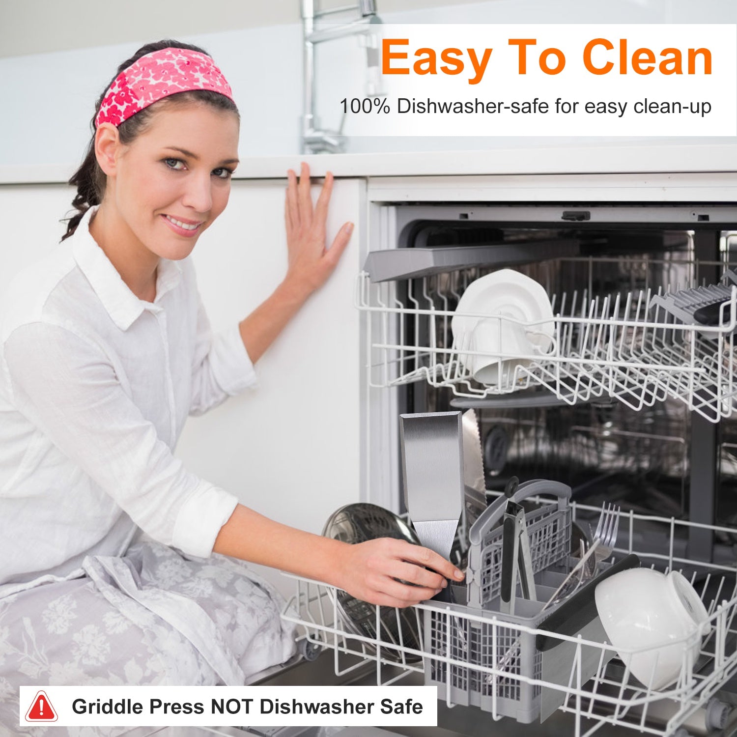 - *Easy To Clean*: Most tools in this grill cooking kit are dishwasher safe,ensuring that them stay in top condition with minimal effort.The stainless steel and cast iron components can be wiped down with a simple cleaning brush. Note:The grill press is NOT Dishwasher safe.
